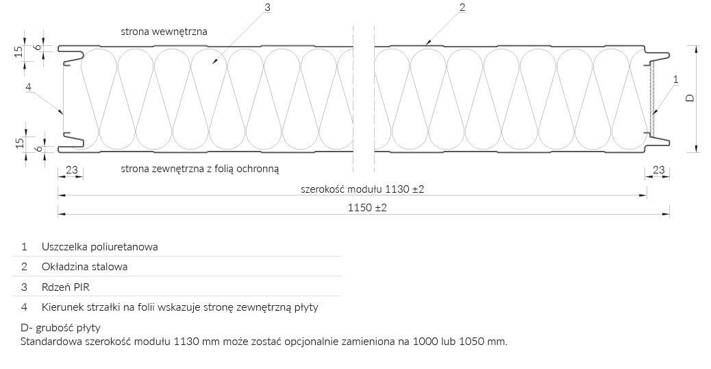 Rodzaj płyty Rodzaj rdzenia Typ łączenia Grubość [mm] Szerokość modularna [mm] Profilacja zewnętrzna Profilacja wewnętrzna Kolor zewnętrzny Kolor wewnętrzny Lokalizacja budowy