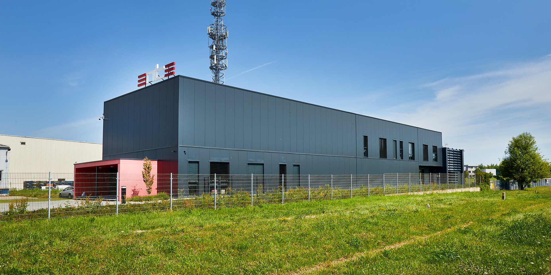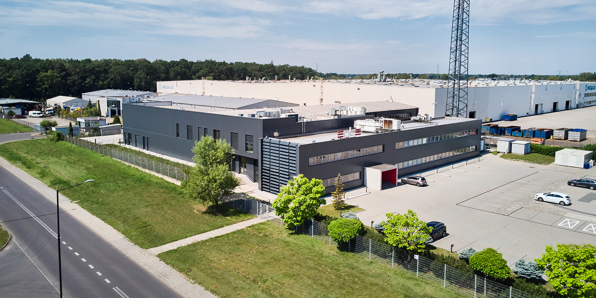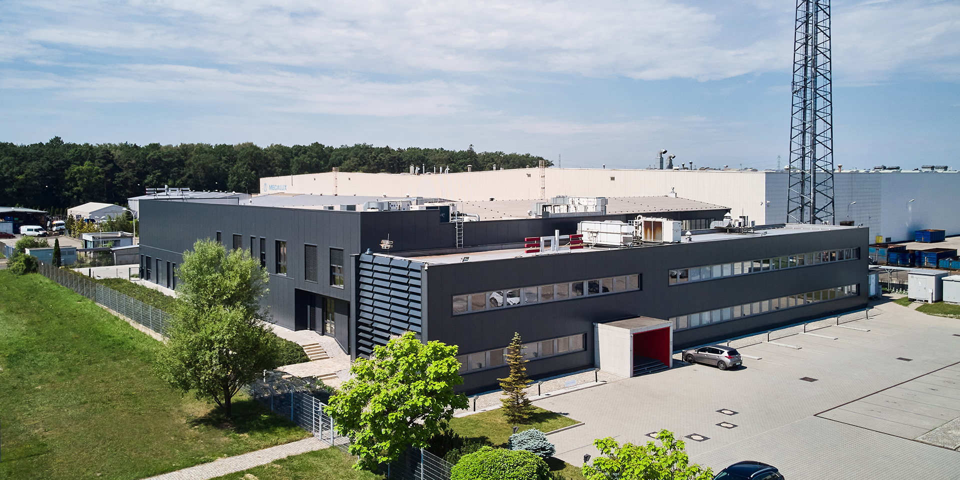 Opis: Obiekt wykonany m.in. z płyty warstwowej ściennej z rdzeniem z wełny mineralnej PWW-SU Paneltech o grubości 200 mm. Płyty w kolorze RAL 7016 o profilacji MF-mikrofala zostały zamontowane w układzie pionowym.
