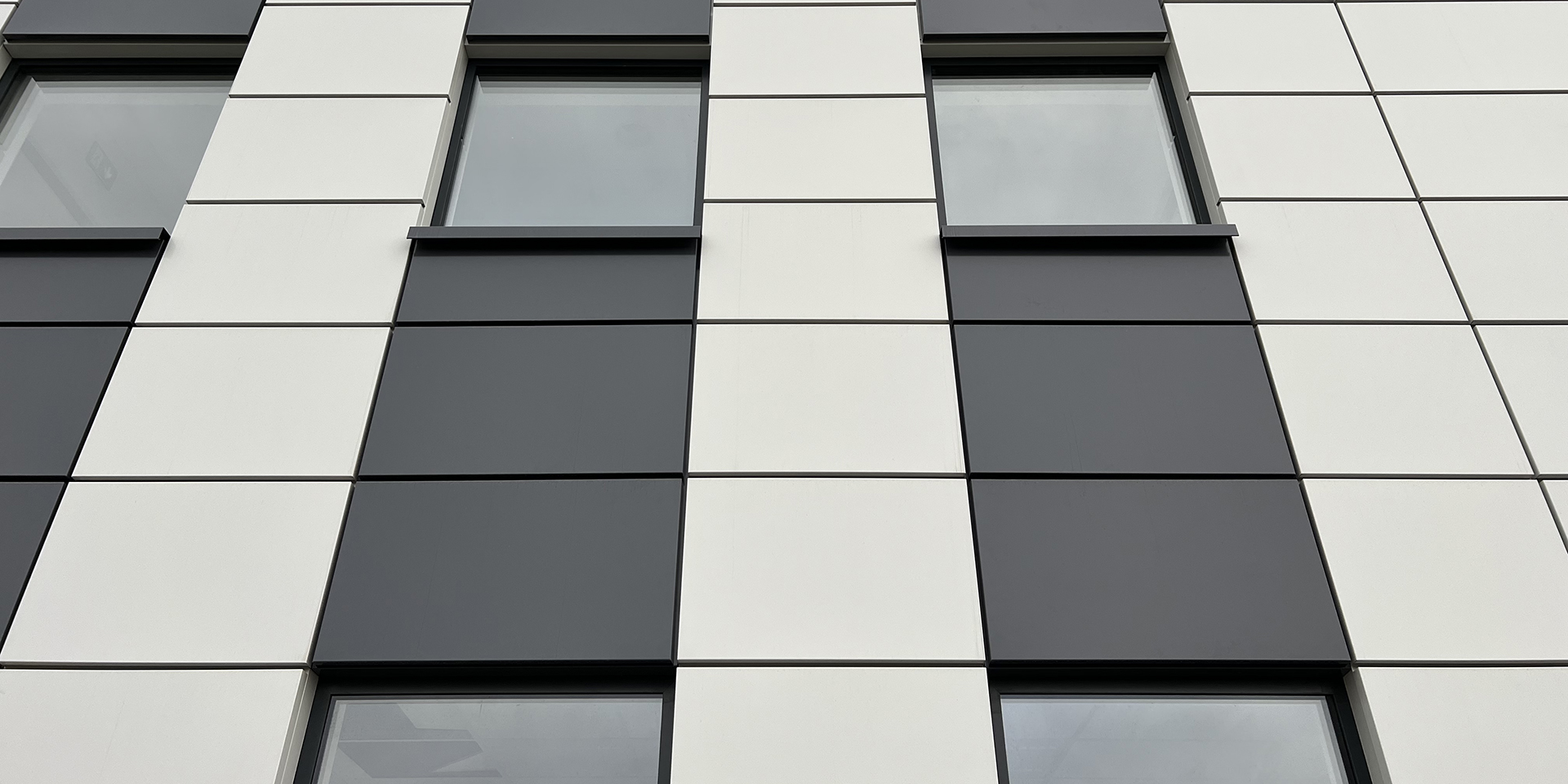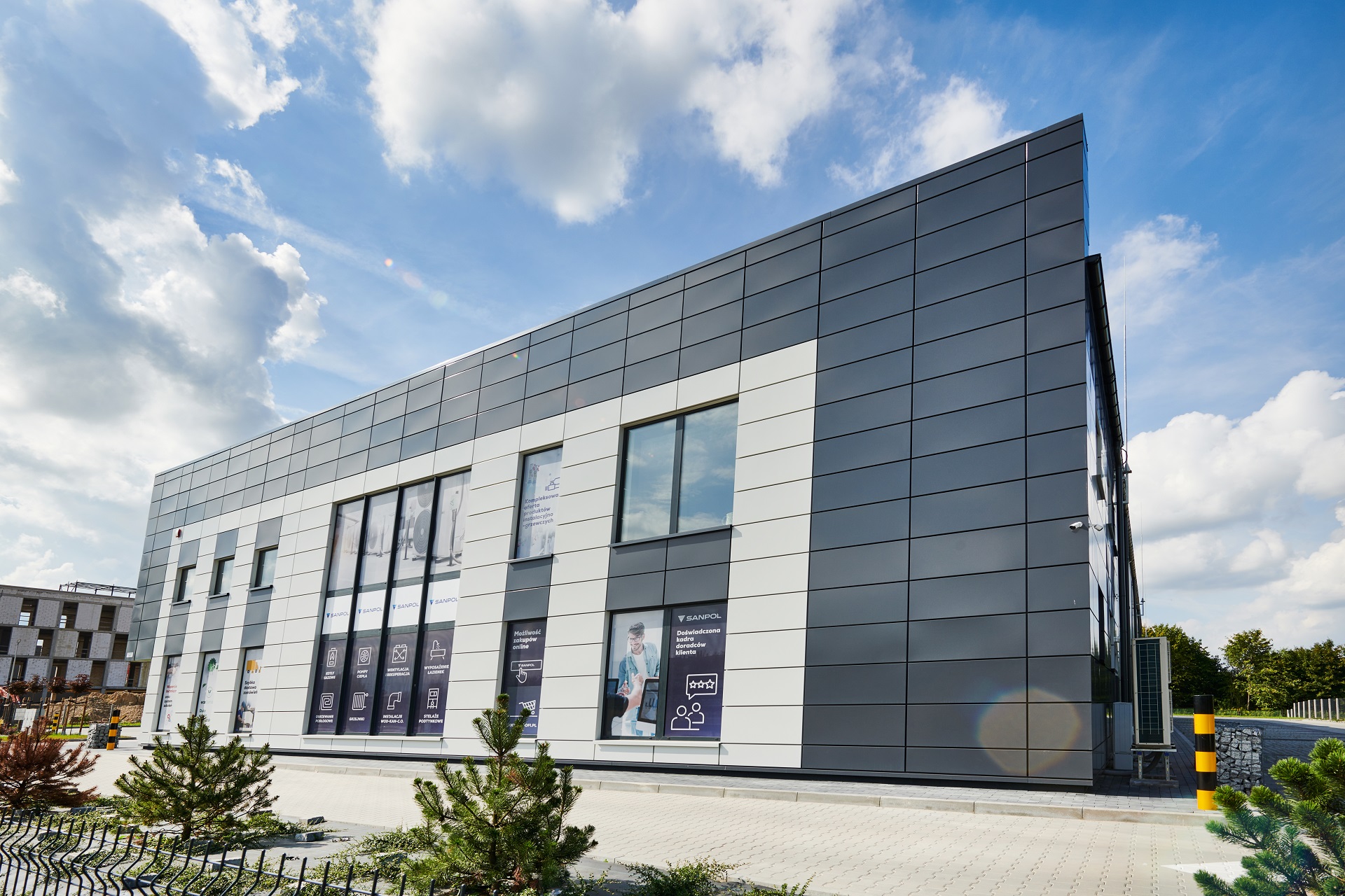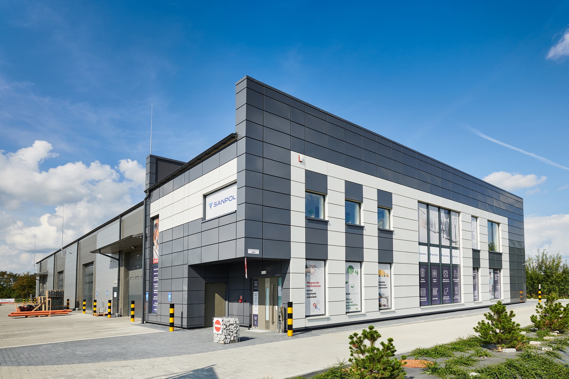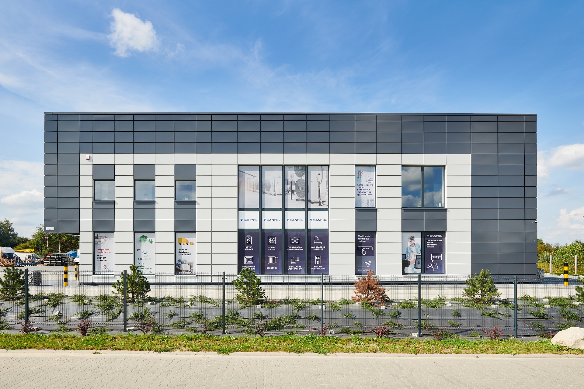 Opis: Biurowiec wykonany z kasetonów elewacyjnych Paneltech w kolorach RAL 7015 oraz 7035.