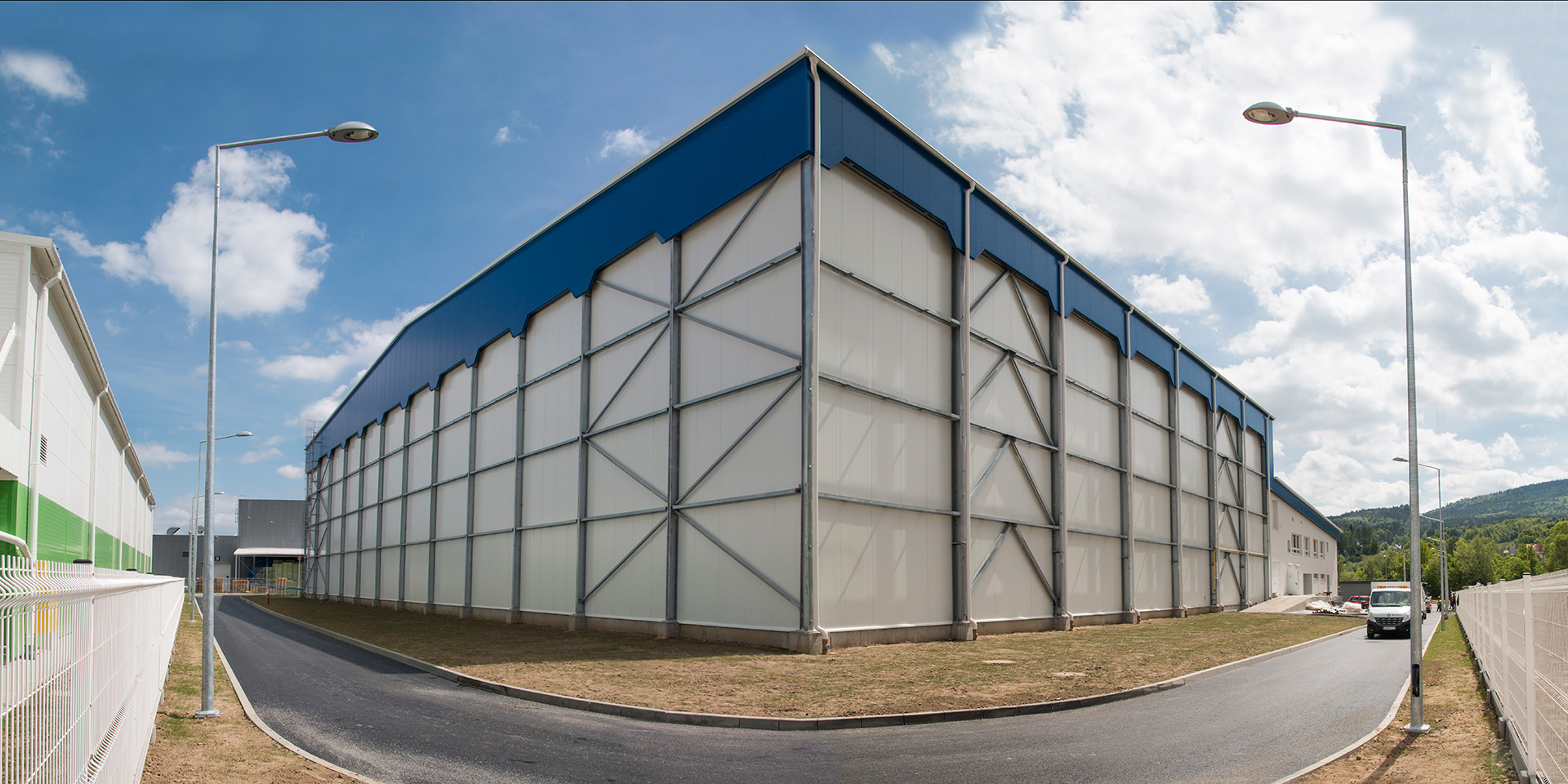 Opis: Dachowe oraz ścienne płyty warstwowe Paneltech użyte do budowy hali magazynowej w Myślenicach. W obiekcie zostały zastosowane płyty z rdzeniem poliizocyjanurowym w kolorach 5010, 9006 oraz 9002.