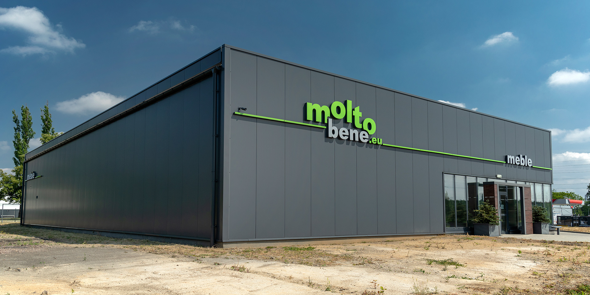 Opis: Salon meblowy w Rudzie Śląskiej wykonany z płyt warstwowych ściennych z ukrytym łącznikiem PW PIR-SU Paneltech. Płyty w kolorze grafitowym RAL 7024 zamontowano w układzie pionowym.